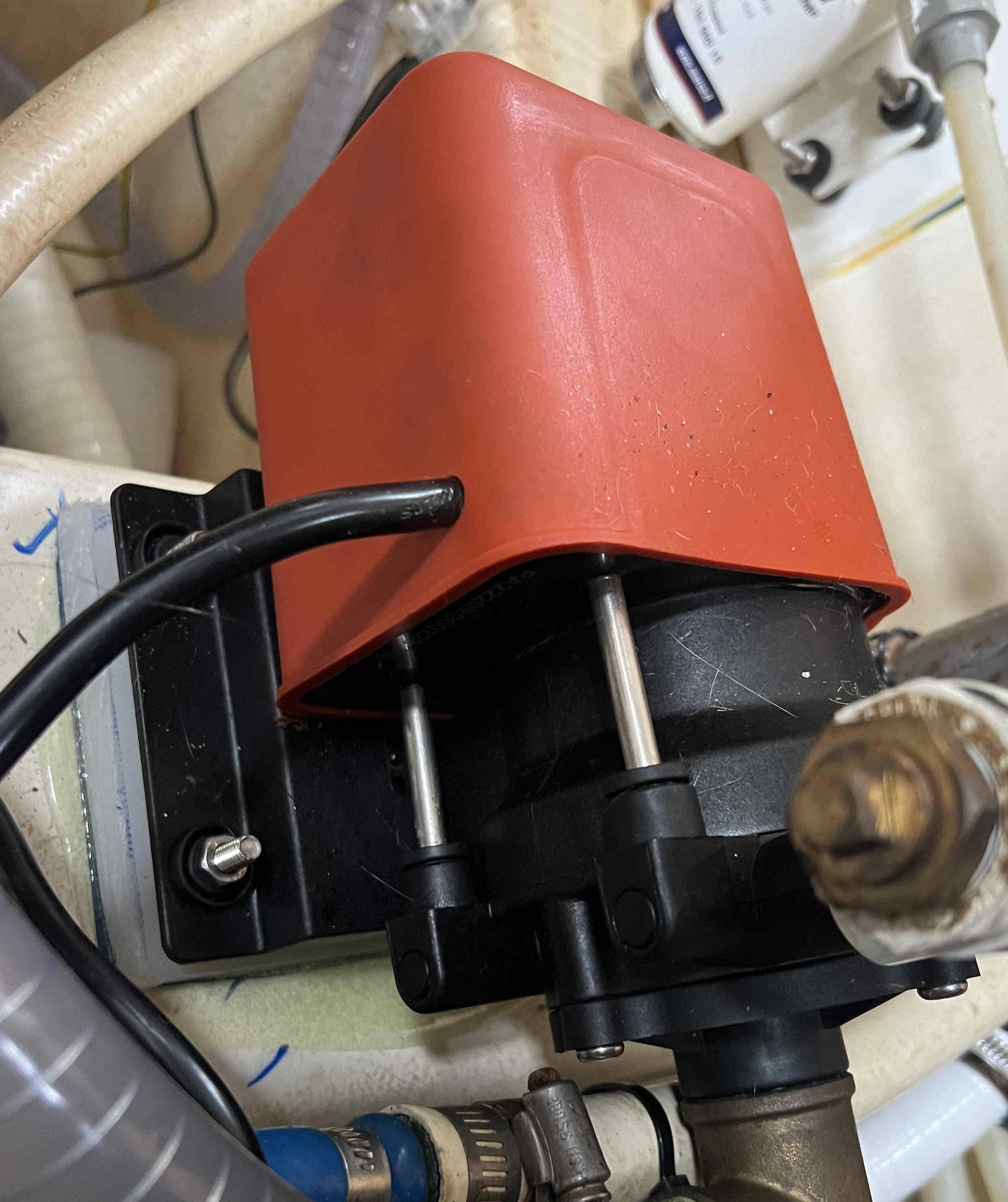 Its much quieter than our previous (corroded) little giant pump. Fully submersible is a big plus for handling AC voltages in a potentially wet bilge. Has no issue clearing air from the outlet pipe.