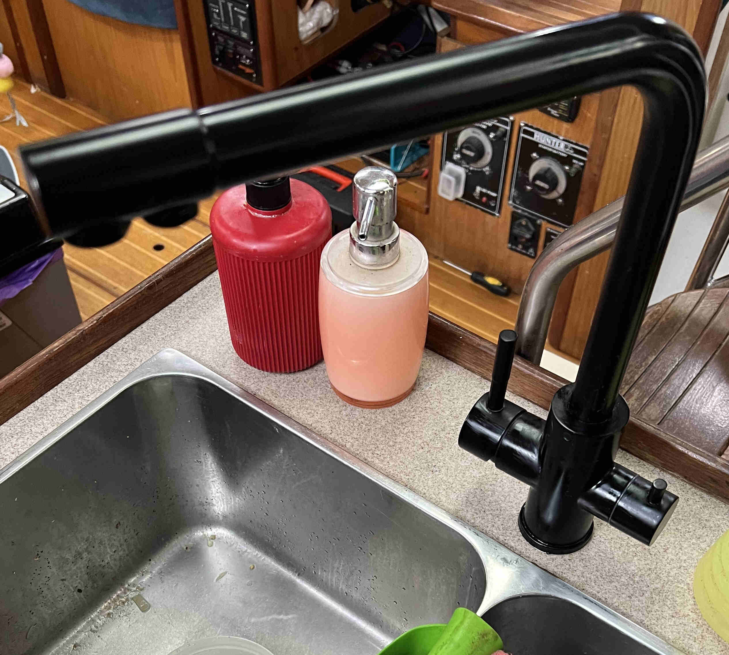 Hook up a saltwater pump for infinite boat water! This faucet has a second tap/valve thats meant for filtered drinking water, but is perfect for saltwater instead.